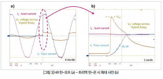 그림 3.a는 이 위상에서 발생하는 전압 스파이크를 나타낸 것이며, 이것은 정확하게 트리액이 온 상태로 스위칭할 때, 즉 전체 부하 전류가 갑자기 릴레이에서 트리액으로 스위칭될 때에만 나타난다. 그림 3.b는 트리액을 통한 전류 증가 현상을 확대해 나타낸 것이다. dIT/t 속도는 8A/μs에 가깝다.