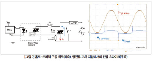 이 회로의 동작원리로 인해 그림 2에 나타낸 바와 같이 스파이크 전압이 각 영전류 교차(Zero Current Crossing) 지점에서 나타나며, 내장(built-in) 영전압 교차(Zero-Voltage-Crossing) 회로를 사용하는 옵토-트리액을 사용하는 경우에도 이러한 현상이 나타난다.