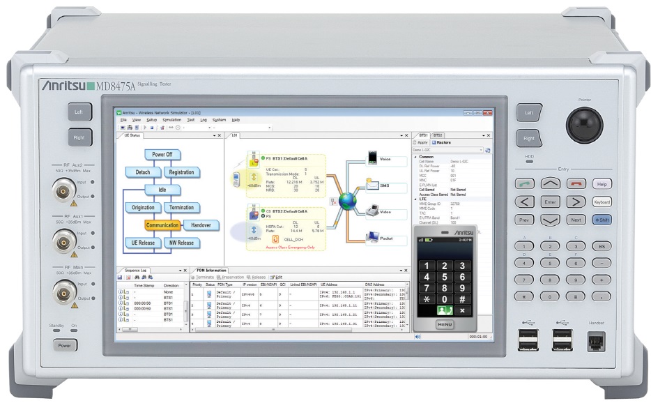 안리쓰 MD8475A는 작은 원박스(One box)에서 필요한 모든 무선 기술을 지원하는 강력하고 신뢰성 높은 네트워크 시뮬레이션이 가능하다. MD8475A의 IMS(IP 멀티미디어 서브시스템) 테스트용 내장 서버는 핵심적인 사용자 기능을 제공한다. MD8475A에는 사용하기 쉬운 그래픽 인터페이스로 통화 파라미터를 손쉽게 편집할 수 있는 SmartStudio가 포함돼 있다. SmartStudio Manager PC 소프트웨어를 사용하면 완전히 자동화된 테스트 시퀀스를 손쉽게 개발하고 실행할 수 있다. 삼성 엔지니어들은 이 사용하기 쉬운 툴로 IMS 연결 기능을 포함해 스마트폰의 기능을 검증하는 자동화 테스트 시퀀스를 100가지 이상 개발했다. 전 세계의 여러 삼성 연구개발 시설은 이 솔루션을 도입해 스마트폰 제품군을 효율적으로 테스트하고 있다.