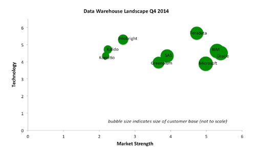 인포메이션 디퍼런스(The Information Difference)는 매해, 최고의 데이터웨어하우징 벤더를 포함한 데이터웨어하우징 시장 전망 보고서를 발표하고 있다. 지난 1월 30일 발표된 이 보고서는 레퍼런스 고객 조사로 측정된 고객 만족도, 기술에 대한 애널리스트의 평가, 기술적 성숙도, 인포메이션 디퍼런스 기능성 모델에 근거한 기술적 적용 범위 등의 여러 요소를 기반으로 가중 점수를 매겼으며 이 점수에 따라 각 벤더의 위치를 나타내었다.