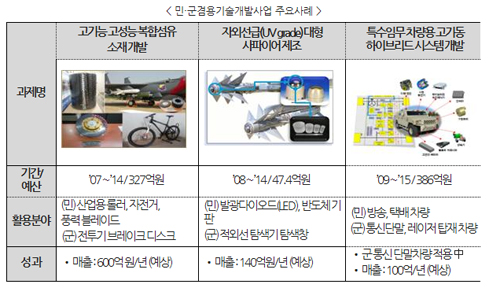 「민·군 겸용기술 개발사업」을 통해 최근 국산화 개발에 성공한 주요 우수 사례로는, ① 탄소복합소재: 친환경차, 무인기, 풍력블레이드 및 전투기 부품 등에 활용 유망, ② 자외선급 대형사파이어: 발광다이오드(LED), 반도체 기판 및 적외선 탐색기 탐색창 등에 사용 가능, ③ 특수임무 차량용 고기동 하이브리드 시스템: 개발 마무리 단계로써 민간부문의 방송, 택배차량과 국방부문의 통신단말, 레이저 탑재차량에 활용할 수 있을 것으로 기대를 모으고 있다.