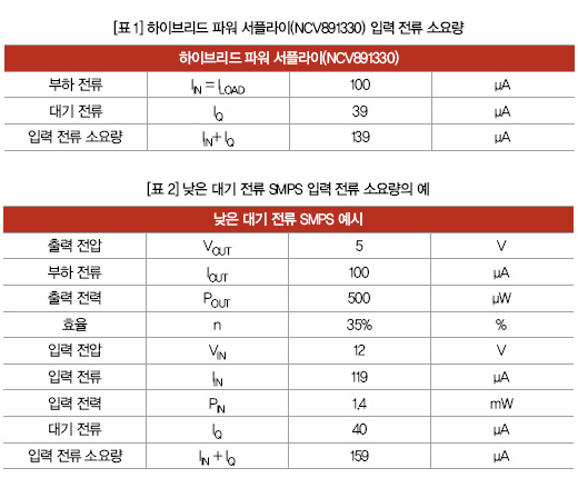 이처럼 낮은 대기 전류 SMPS는 대기전류가 하이브리드 파워 서플라이와 대등하거나 그보다 낮아질 수 있다. 그러나 경부하/대기 전류 여부는 전반적인 입력 전류 요구량이 낮을수록 버스트 모드의 전반적인 효율, 부하 전류, 그리고 대기 전류에 좌우된다. 예를 들어, 12 V 입력, 12 V 출력, 부하 100 μA, 대기 전류 39 μA의 하이브리드 파워 서플라이를 위해서는 선형 139 μA 입력 전류가 요구된다(표 1 참조). 그러나 같은 12 V 입력, 15 V 출력, 부하 100 μA, 대기 전류 40 μA 조건에서 35% 이하로 부하 효율이 낮은 대기 전류 SMPS의 입력 전류 소요량은 하이브리드 파워 서플라이보다 14% 높은 159 μA이다(표 2 참조).