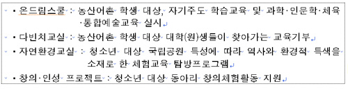 - 농산어촌 소재 자유학기제 운영학교의 체험활동 지원을 위해 “찾아가는 자유학기제 진로체험단(가칭)”을 운영하여 도농간 교육격차 해소에 적극 기여할 계획이다.