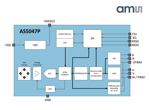 증가분 ABI 신호 출력의 AS5047P 신제품, 획기적으로 낮은 시스템 비용 달성 및 고정밀 성능 실현으로 모터 및 모션 제어 시스템에서 광학식 엔코더 및 리졸버 대체