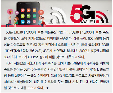 ”2015 MWC를 기점으로 5G에 대한 세계 통신사들과 각국 정부의 관심이 고조되는 가운데, 우리나라 정부는 올해에만 약 680억 원을 기술 개발에 투자할 계획이다. 미래부 관계자는 “기술 개발이 선행돼야 표준화가 비로소 가능한 것”이라며 “표준화 작업은 2017년 하반기 중 본격적으로 시작될 것”이라고 밝혔다.
