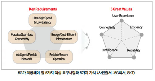 백서는 ▶LTE 대비 1,000배 빠른 속도와 낮은 지연 응답, 실감형 콘텐츠 ▶1,000배 많은 디바이스 및 트래픽 수용, 끊김 없는 연결성 보장 ▶소프트웨어 기반 구조, 실시간 데이터 분석, 지능화·개인화된 서비스 제공 ▶99% 이상의 네트워크 지속성과 신뢰성 ▶LTE대비 50 ~ 100배 수준의 에너지 효율성, 인프라/디바이스의 저(低)비용화 충족의 요소를 5G가 갖춰야 할 다섯 가지 조건(Key Requirement, 핵심 요구사항)으로 정의하고 있다. 셀 당 최대 50 Gbps 이상의 용량을 제공해야 하며, 사용자 당 데이터 속도는 어디서나 1 Gbps 이상을 보장할 수 있어야 한다.