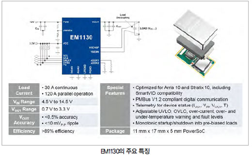 30A의 전류를 공급할 수 있는 EM1130은 Arriaⓡ 10과 Stratixⓡ 10 FPGA 코어 및 트랜시버 전원 레일을 비롯해 알테라의 10세대 FPGA에 이용하기 위한 디지털 제어 방식의 벅 DCDC컨버터 제품군의 첫 번째 제품이다.