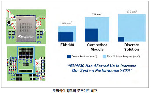 웨덴 이사는 “EM1130은 가장 작은 풋프린트로 타의 추종을 불허하는 시스템성능을 가능하게 하며, 모듈화한 경우에 전체 솔루션 풋프린트는 동급의 다른 경쟁 모듈들과 비교해 절반 이하다”고 강조했다. EM1130의 전체 솔루션 크기는 360 mm2다.