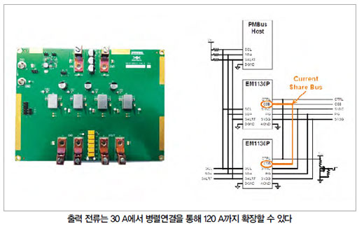 EM1130은SmartVID기능 및 PMBus v1.2 규격의 디지털 인터페이스를 제공한다. 출력 전류는 30 A에서 병렬연결을 통해 120 A까지 확장할 수 있다. 웨덴 이사는 “EM1130을 최대 6개까지 병렬 연결하여 최대 출력 180A까지 달성한 사용자도 있다”고 소개했다.