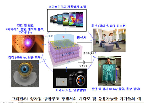 ’14년 그래핀을 이용한 광센서를 개발한 연구팀은 금속을 그래핀으로 대체, 그래핀과 실리콘 양자점 융합구조의 다이오드를 제작하고, 광센서에 적용함으로써, 상용 광센서 수준의 효율(~0.35 A/W)을 보이고, 가시광선 등 짧은 파장의 빛에 반응성이 향상된 광센서를 개발했다.
