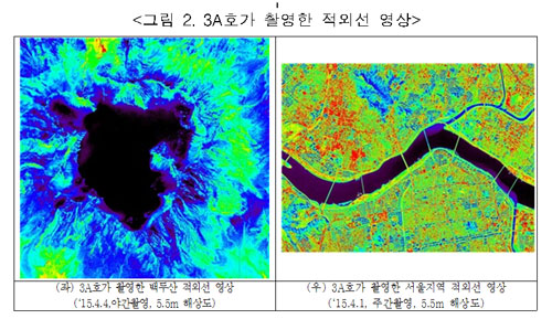 그림 2의 좌측 영상은 다목적실용위성 3A호의 열적외선 카메라로 야간에 백두산을 촬영한 영상으로, 온도가 낮은 백두산 천지 부분은 어두운 색으로 나타나 주변 지역과의 온도 차이를 확인할 수 있다.