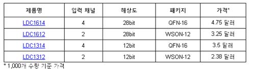 LDC1614 제품군의 각 디바이스는 모두 4mm x 4mm 단위로 측정하며, I2C 인터페이스로 쉽게 구성할 수 있다. 각 디바이스의 가격 및 패키지는 다음과 같다.