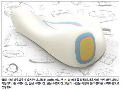 ICT 기반 헬스케어 국내 기업인 바우와우는 최근 IoT와 베개를 접목한 마시필로 스마트 에디션을 출시했다. 마시필로 스마트 에디션은 사용자의 수면 패턴 파악이 쉽게 가능하다. 총 수면시간, 깊은 수면시간, 얕은 수면시간, 코골이 시간을 측정하고, 그 결과를 스마트폰으로 전송해 사용자가 수면 패턴을 스스로 개선시킬 수 있도록 돕는다.