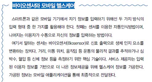 모바일 헬스케어 산업이 무선통신기술의 발전과 웨어러블 스마트기기 출현과 맞물려 크게 주목받고 있다. ‘모바일 헬스케어(Mobile Healthcare)’란 시공간의 제약없이 의료서비스를 받는 것을 말한다. 개인은 스마트폰과 의료 측정 앱을 통해 운동량, 심장상태 등을 체크해 스스로 건강관리가 가능하다.