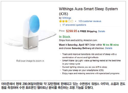 이외에도 숙면을 돕는 제품으로는 워씽스 아우라(Withings Aura)가 있다. 위씽스 아우라는 침대 밑에 두는 수면 센서다.