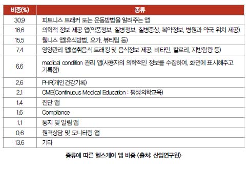 현재 시중에 출시된 모바일 헬스케어 앱은 약 4만 개 이상으로 집계된다. 운동 관리와 식단, 생체정보 측정, 의학정보 제공이라는 4가지 큰 틀로 분류된다.