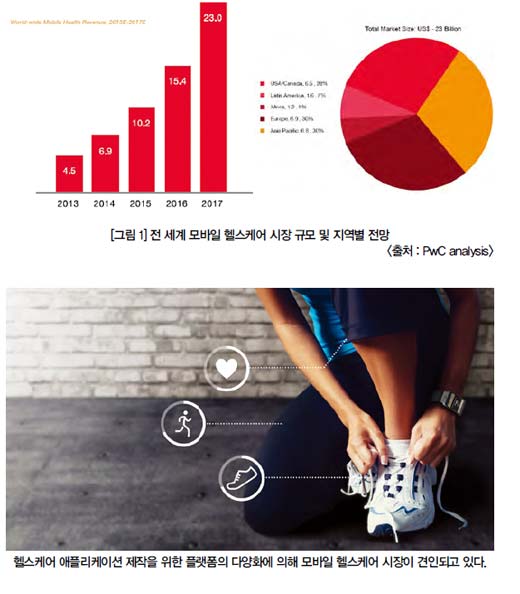 모바일 업계 단체인 GSMA와 PwC에 의하면, 모바일 헬스케어 시장은 2014년 현재 약 69억 달러 규모이다. 모바일게임 시장이 2014년 현재 약 200억 달러인 점을 감안하면 대단한 규모는 아니다. 그러나 이 시장은 2017년에 230억 달러 규모로 성장할 전망이다(그림1). 또한 mHealth Watch가 2014년 8월 발표한 세계 모바일 헬스케어 시장보고서는 이 시장이 2013년부터 2020년까지 연평균 성장률 32.3%를 기록하며 2020년 말까지 588억 달러에 달할 것이라고 예측했다.