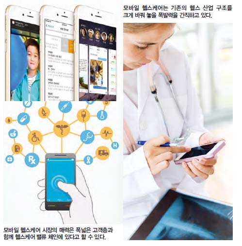 모바일 헬스케어 시장의 매력은 폭넓은 고객층과 함께 헬스케어 밸류 체인에 있다고 할 수 있다. 의료종사자가 휴대전화나 스마트폰을 이용해 방대한 증거 자료를 관리 및 활용하는 흐름을 단순화할 수 있음은 물론, 환자뿐만 아니라 질환이 없는 정상인도 포함한 모든 사람들이 개인에 관련된 데이터(검진 데이터, 일상생활의 기록 등)를 쉽게 관리할 수 있다.