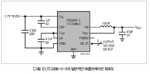LTC3388-1/-3은 3 mm × 3 mm(또는 MSOP10-E) 패키지에서 최대 50 mA 연속 출력 전류를 공급할 수 있는 20 V 입력 가능 동기식 벅 컨버터이다(그림 1 참조). LTC3388-1/-3은 2.7 V ~ 20 V의 입력 전압 범위에서 동작하므로 “상시 동작” 센서 및 산업용 제어 전력을 비롯해 광범위한 에너지 하베스팅 및 배터리 구동 애플리케이션에 적합하다.