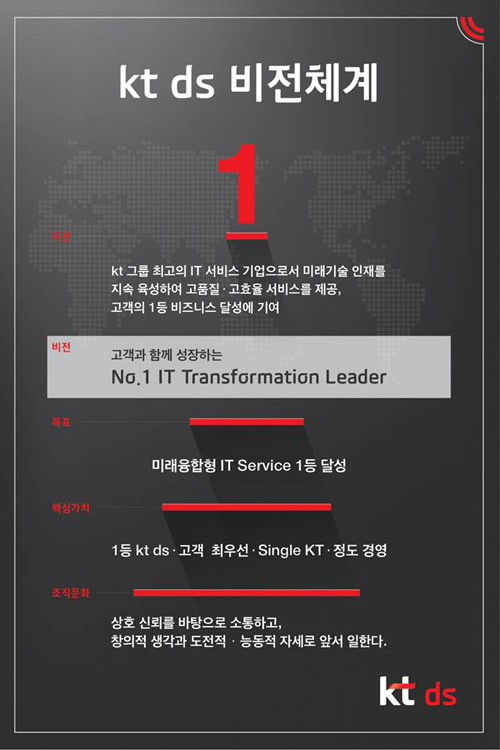 특히, 새로운 비전은 임직원의 참여로 완성됐다는 점에서 의미가 크다. 지난 1월 김기철 사장이 취임한 직후 신 비전체계 전담반이 구성됐고, 설문조사와 워크숍 등을 통해 임직원 81%(1067명)의 의견을 직접 청취해 완성됐다. 이와 함께 인재상 수립과 인사제도 개선 등 혁신활동도 본격화했다. kt ds의 강한 혁신 의지는 슬로건 ‘오늘도 Do Better, 내일은 두 배로’에 담았다.
