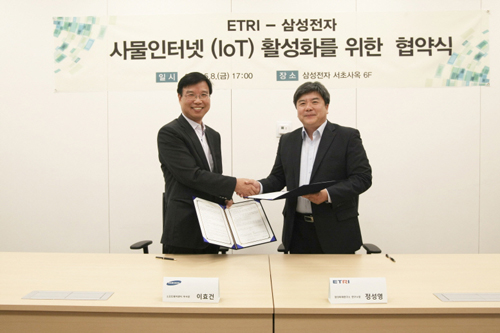 ETRI(한국전자통신연구원, 원장 김흥남)는 지난 8일, 삼성전자와 IoT 분야의 협력을 위한 상호협력 의향서를 교환하고, IoT 관련 오픈소스 및 표준화 활동 등에 대한 긴밀한 공조 체계를 구축하기로 하였다고 밝혔다.