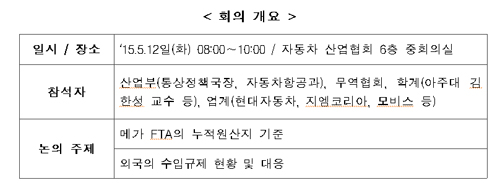 산업통상자원부(장관 윤상직)와 한국무역협회(회장 김인호)는 ‘15. 5. 12.(화) 오전에 ‘2015년 상반기 통상산업포럼 자동차 분과회의’를 열어 메가 자유무역협정(이하 FTA) 협상에서 논의 중인 누적원산지 규정과 외국의 수입규제 현황 및 대응을 논의 했다.