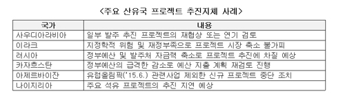 또한 우리 기업들은 중동 각지에서 추진 중인 각종 프로젝트에 대한 리스크 관리를 철저히 해야 한다. 산유국에서 진행되는 대부분 프로젝트의 재원이 국가 재정인 경우가 많다. 현지 정부들은 유가하락으로 재정수입이 감소하면서 각종 프로젝트에 대한 자금지원을 줄이거나 취소시킬 가능성이 커지고 있다는 것이다. 실제로 이번 조사에서 신규 프로젝트의 취소 혹은 연기 사례가 다수 조사되기도 했다.