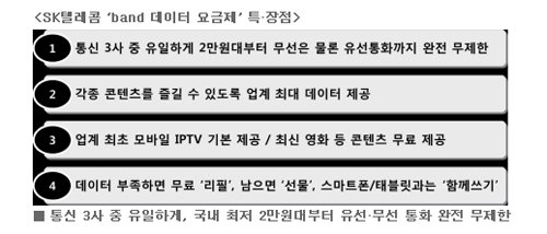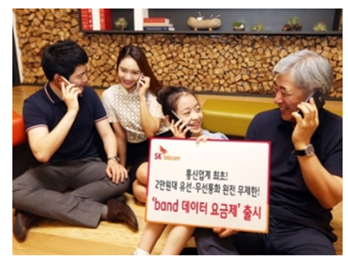 SK텔레콤(대표이사 사장 장동현, www.sktelecom.com)은 통신3사 중 유일하게 국내 최저인 2만원대에 ‘무선’은 물론 ‘유선’ 통화까지 무제한 제공하고, 업계 최고 수준의 데이터 및 특화 혜택까지 더한 ‘band 데이터 요금제’를 20일 출시한다고 밝혔다.