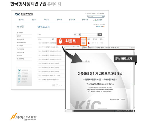 한국형사정책연구원은 사이냅소프트(대표:전경헌)의 사이냅 HTML 변환기를 홈페이지에 적용해 연구보고서와 각종 자료 등의 PDF, 한글 파일 문서를 뷰어 없이 웹브라우저에서 빠르고 간편하게 볼 수 있게 개선했다.
