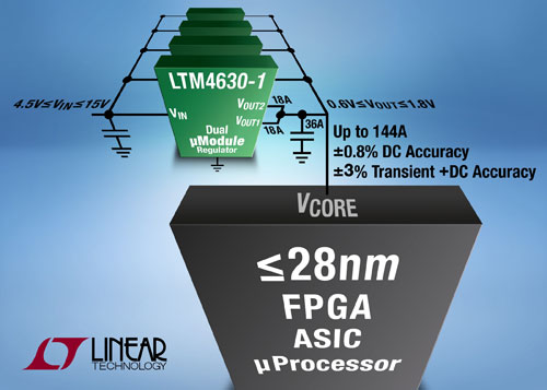 리니어 테크놀로지 코리아(대표 홍사곽)는 28nm와28nm 미만 FPGA를 위해 높은 정밀 출력 전압 레귤레이션을 제공하는 듀얼 18A 또는 단일 36A µModule® (마이크로모듈)(제품명: LTM4630-1)을 출시했다고 밝혔다. 최첨단 디지털 디바이스의 핵심 전압은 꾸준한 상태(DC)와 고속 부하 전류 과도상태일 때 매우 정확한 전압 레귤레이션이 요구된다.