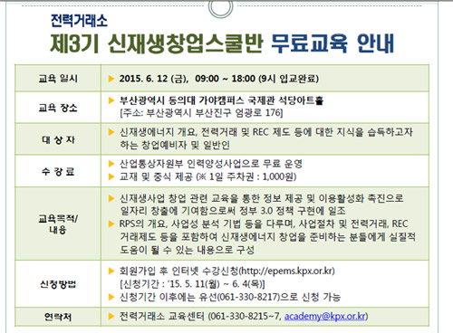 이 교육은 신재생에너지 창업을 고민하는 분들의 일자리 창출에 객관적이고 실질적인 도움을 주기 위하여 전력거래소에서 정부3.0 시책의 일환으로 작년부터 개설한 1일 과정 교육으로서, 주요 내용은 전력시장 및 REC 거래시장의 이해, 사업성분석 및 사업절차 등이며 교육비는 무료이다.