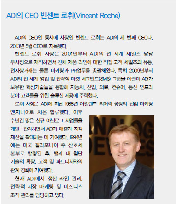 2001년부터 ADI의 전 세계 세일즈 담당 부사장으로 재직해 온 빈센트 로취 사장은 전체 제품 라인에 대한 직접 세일즈와 유통, 전자상거래 업무, 마케팅과 PR업무를 총괄해왔다. 특히, 2009년부터 ADI의 전 세계 영업 및 전략적 마켓 세그먼트(SMS) 그룹을 이끌며 기술들을 통합해 자동차, 산업, 의료, 컨슈머, 통신 인프라 분야 고객들을 위한 솔루션 제공에 주력해왔다.