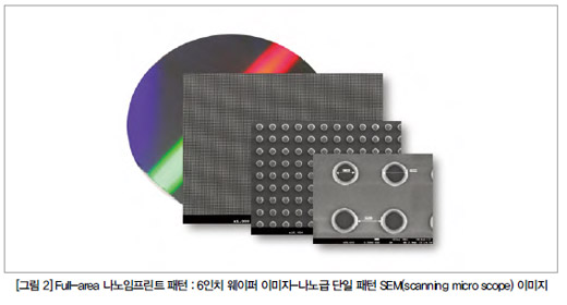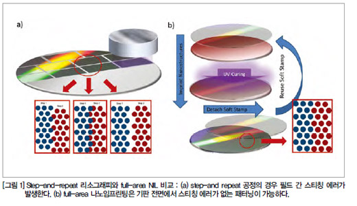 실제 패터닝을 위해 기판에 UV 경화 레지스트를 코팅한다. 다음 투명한 워킹 스탬프를 기판에 접촉시킨다. 레지스트를 UV로 경화한다. 마지막으로, 워킹 스탬프를 분리하고 재사용한다. 이는 위의 설명과 같다(그림 1b). full-field UV NIL을 포함해 이와 같은 공정은 스티칭 에러를 발생시키거나 현저한 비용 증가없이 효율적으로 패턴 사이즈를 감소시킬 수 있다. 그림 2와 같이 스티칭 에러 없는 나노급 패턴 구현은 이미 최대 6인치 웨이퍼까지 적용되어 현재 LED 생산에 사용되고 있다.