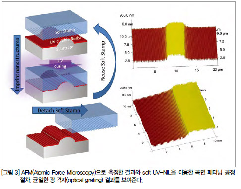 마이크론보다 작은 CD 구현에 필요한 높은 개구수(numerical aperture)로 인해 초점 심도는 수백 nm 밖에 되지 않는다. 이와 대조적으로 UV-NIL은 40 nm 이하 수준까지 패터닝이 가능하고, 소프트 스탬프를 사용하는 경우(‘soft UV-NIL’라고 불림), 단차가 있거나 곡면에도 패터닝이 가능하다(그림 3). 이와 같은 나노구조는 마이크로 분광기의 스펙트럼 필터 또는 도광 구조의 격자 구조를 적용할 때 적합하다.