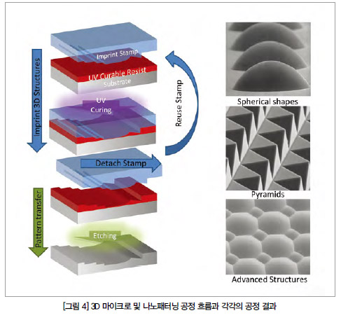 일반적인 노광에서는 구조물을 층층이 쌓을 수 있도록 할 뿐이다. 이것은 전자산업 요구에는 이상적이지만, 광구조 공정에는 적합하지 않다. 이와 대조적으로 soft UV-NIL은 첫 장에서 3D 패터닝이 가능하기 때문에(그림 4), 광 관련 상호작용이 대부분 형태 및 기하학적 구조에 따라 결정되는 포토닉스 산업에 적합하다. soft UV-NIL은 한 번의 공정으로 다양한 높이의 패턴을 생성할 수 있기 때문에, 높은 정렬 정확도가 요구되지 않는다.