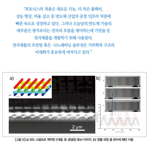 UV-NIL은 표준 광을 사용해서 100 nm 이하까지 높은 정렬 정확도를 확보할 수 있어 3D 광결정 등 복잡한 구조가 필요한 3D 구조도 구현이 가능하다.4,5 이와 같은 공정은 그림 5a 삽화에 표시된 바와 같이 3D 광결정이 층층이 적재된다. 대면적의 선 격자를 사용해 3D 스택을 쌓으면서 90도씩 회전시켰다. 이 경우 원하는 디바이스 성능 구현을 위해서는 정확한 정렬이 필수적이다. 그러므로 소프트 스탬프가 선호되는 첫 장 사진 공정과 달리 하드 스탬프의 사용이 필수적이다.