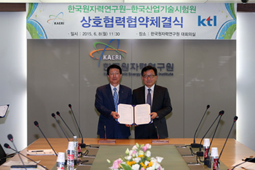 한국원자력연구원(원장 김종경)은 한국산업기술시험원(원장 이원복)과 국제 표준에 적합한 기기 개발 및 검증 통한 원전 안전문화 정착과 국민 신뢰 회복을 위해 협력키로 합의하고 6월 8일 오전 11시30분 한국원자력연구원 대회의실에서 상호협력협약을 체결했다.