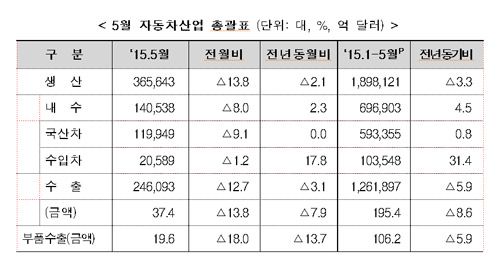 ‘15.1~5월 완성차 실적은 전년동기대비 생산 3.3%, 수출 5.9% 각각 감소하였으나, 국내 판매는 신차출시(투싼, 티볼리) 등으로 4.5% 증가했다.