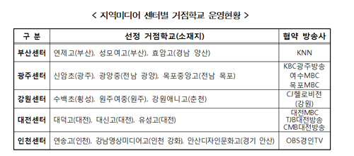 방송통신위원회(위원장 최성준)는 청소년들의 방송콘텐츠 제작 분야 적성을 조기에 발굴하여 미디어 꿈나무로 육성하기 위해 전국 5개 지역 시청자미디어센터를 통해 9개 지역 방송사들과 협력약정(M.O.U.)을 체결하고 미디어교육 거점학교 프로그램을 본격적으로 운영한다.