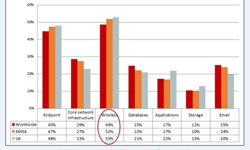 무선 인프라는 49%라는 높은 수치로 IT 인프라에서 가장 취약한 부분으로 나타났다. 이어 엔드 포인트 디바이스가 45%로 나타났으며, 코어 네트워크 인프라가 가장 취약하다고 응답한 경우는 겨우 29% 였다.
