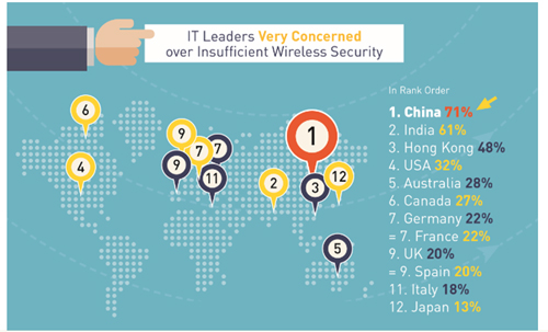전세계의 ITDM들은 무선 보안 분야에 대해 다양한 신뢰도 수준을 보였으며, 이 중 일본에서 13%가 ‘매우 우려’라고 답한 것과 대조적으로 중국은 71%가 ‘매우 우려’한다고 답했다.  연구결과는 무선 보안에 대해 ‘우려’라고 답한 비율이 평균 보다 높게 나타난 2국가(중국과 인도)에 비해 가장 낮게 응답한 2개국(이탈리아와 일본)의 응답자를 통해, 향상된 보안 인식이 보다 높은 수준의 우려를 불러 일으키는 보고 있다.