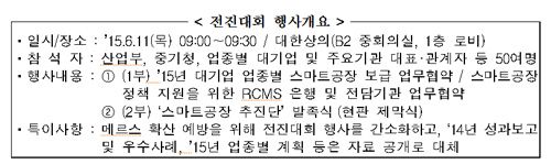 산업부(장관:윤상직)는 박근혜 정부 핵심개혁과제인 “제조업 혁신 3.0 전략”의 일환으로 추진 중인 스마트공장 보급‧확산을 위해 6월11일 「스마트공장 전진대회」를 개최, “8대 업종의 9대 대기업”이 협력사 등을 대상으로 올해 350개사 이상의 스마트공장 구축에 착수한다고 밝혔다.