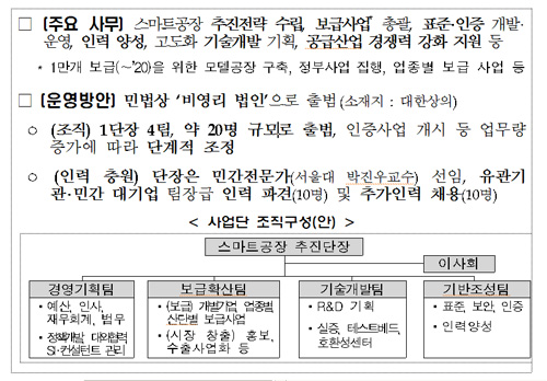 앞으로 추진단이 스마트공장 보급·확산 사업을 총괄하고, 독일·미국 중심으로 진행되는 미래형 스마트공장 추진에 적극 대응하기 위한 스마트공장 관련 기술개발 방향 제시, 표준·인증 등도 총괄할 예정이다.