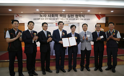 SK하이닉스(대표: 박성욱, www.skhynix.com)가 16일(火) 이천 본사에서 임직원의 임금 인상분 20%를 협력사에 지원하기 위한 ‘노사 사회적 책임 실천 협약식’을 맺었다.