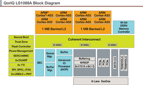 업계에서 가장 폭넓은 ARM의 멀티코어 네트워킹 SoC 포트폴리오의 범위를 더욱 넓히는 코어아이큐(QorIQ) LS1088A 및 LS1048A 프로세서는 최고 1.5GHz로 작동하는 Cortex-A53 코어를 탑재했다. 이 디바이스는 DDR4 메모리 컨트롤러와 최대 2개의 10Gb/s 및 8개의 1Gb/s 이더넷 인터페이스(L2 스위치 기능)를 포함하는 탁월한 통합성을 제공한다. 이러한 초저전력 프로세서는 인텔리전트 엣지 액세스 장비, NFV 및 가상 CPE 솔루션, 산업용 제어 시스템 및 인텔리전트 NIC 애플리케이션에 맞게 특별히 설계된다.