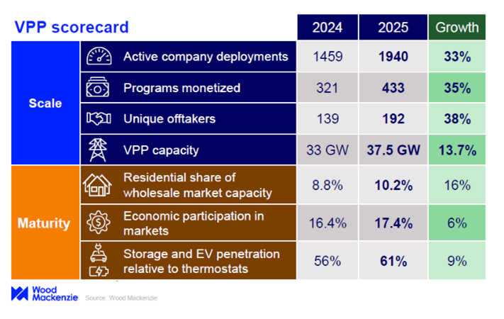 최근 우드맥킨지의 '2025 북미 가상발전소 시장 보고서'에 따르면, 미국 VPP 시장은 지난해 약 37.5GW 규모로 성장했다. 이는 전년 대비 13.7% 증가한 수치다. 또한 VPP 참여 기업 수, 전력 구매자 수, 수익화된 프로그램 수는 모두 30% 이상 늘어 시장 저변이 크게 넓어졌다.