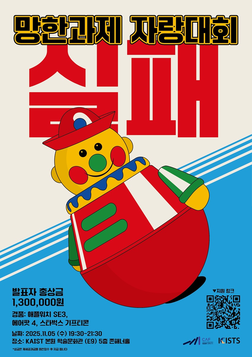 11월 5일 학술문화관 존 해너홀에서는 매년 KAIST 학생들에게 큰 호응을 얻어온 ‘망한 과제 자랑 대회’가 일반인 참여로 확대 개최된다. 실패연구소와 학생동아리 아이시스츠(ICISTS)가 공동기획한 이번 행사는 참여자들이 사진과 영상 등으로 직접 부스를 꾸며 자신의 실패와 극복의 과정을 공유한다.