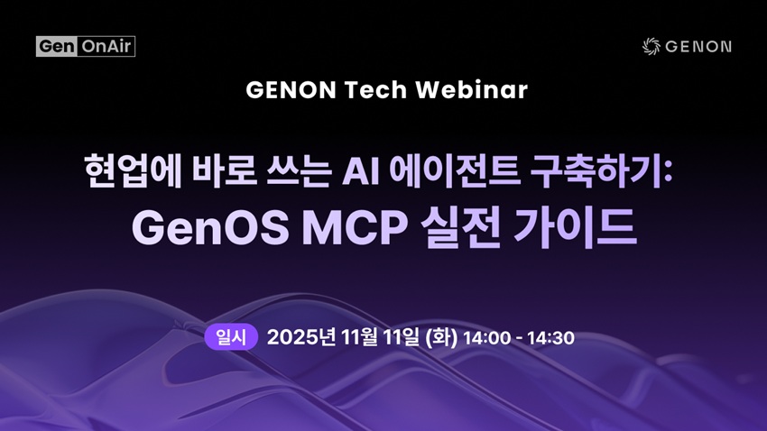 제논(대표 고석태)이 11월 11일 오후 2시 자사 유튜브 채널에서 ‘현업에 바로 쓰는 AI 에이전트 구축하기: GenOS MCP 실전 가이드’를 주제로 정기 테크 웨비나 ‘Gen ONAir(젠온에어)’를 개최한다고 밝혔다.