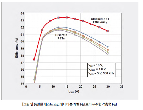 다른 최신 기술의 개별 FET(그림 3)과 비교해 적층형 FET 효율(적색 곡선)은 최소 2.2% 높다. CSD87350과 같은 적층형 FET 스위치는 독특한 디바이스 구조로 인해 온저항(RDS(on))과 게이트 전하가 낮을 뿐만 아니라, 적층형 FET 패키징 기법은 전통적인 와이어본딩 기술과 관련된 기생 인덕턴스를 제거한다.