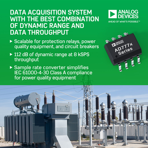 AD7770은 보다 고성능의 소형 폼 팩터(form factor) 보호 릴레이 (protection relays)를 지원하고, AD7771은 전력 그리드의 전기 결함(electrical faults)을 초기에 감지할 수 있는 전력 품질 측정 장비를 지원한다. SoC 시리즈 중 세 번째 제품인 AD7779를 사용하면 회로 차단 장비에서의 작동 시작(power-up)이 빨라진다. AD777x 시리즈의 세 가지 제품은 모두 업계 최고 수준의 동작 범위(dynamic range) 및 데이터 쓰루풋(throughput)의 조합을 제공하며 3상 전력 어플리케이션 내 전류 및 전압 센서로부터 발생하는 출력을 측정하는 8개의 동시 샘플링 채널이 특징이다.